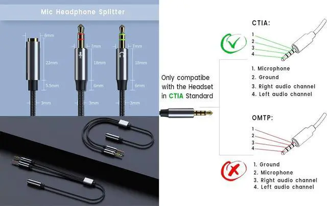 3.5 mm TRRS female to dual TRS male microphone audio Y-adapter - Hooks up headsets or earbuds to a PC or Laptop for the PC game VOIP Skype or chat prams Google Voice etcMic/headphone splitter compatible with HyperX Revolver S / Cloud Core / Cloud Alpha / Cloud Stinger / Cloud II / Astro A10 / LORELEI X6 / Kraken Pro V1 / Plantronics RIG 400HX / Siberia Elite Prism RGB / Bose QC 15 / Beats Solo 3 / Turtle Beach Recon 200 / Razor Nari / H111 / G433 / Turtle Beach XO Four Stealth / BlackShark V2 / V-Moda Boom Pro / Crossfade M-100 / Polk Audio Striker Pro / JBL Everest Elite 700 / Bose QuietComfort 15Kevlar braided audio cable with aluminum shell - Durable strong and tangle-freeGold-plated connector - Bring your superior stereo sound in both outputsNotes: It's only compatible with CTIA standard Android headphones NOT compatible with CTIA standard Earbuds or OMTP standard device