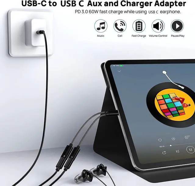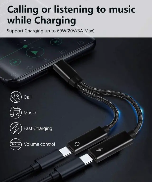 Fast Charging: This usb c headphone adapter and charger support up to 60W PD Charging. you can listen to music and charge your phone at the same time. Built-in a powerful EJ899M Chip satisfies the different needs ensures the stability of charging voltage and current to protect your devices.