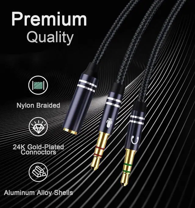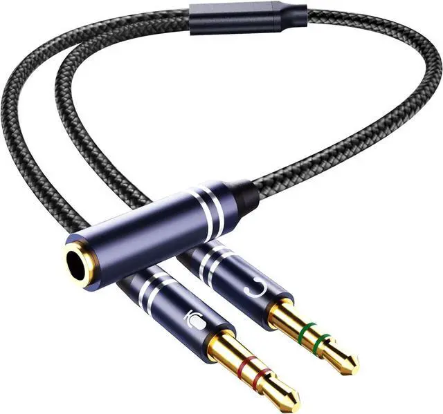 Dual Audio & Mic for Gaming/Work Split a single 3.5 mm TRRS port into separate audio + mic jacks perfect for PC gaming (HyperX Cloud 3/ Kraken) VOIP calls (Skype/Zoom) and online classes. Plug & play no drivers! Hi-Fi Stereo with Zero Noise 24K gold-plated connectors + oxygen-free copper wiring deliver crisp bass and clear vocals ideal for music games and team chats. No signal loss even at max volume! Ultra-Durable 35cm Design Reinforced nylon braided + aluminum shell withstands 10 000+ bends. The 14 inch (35cm) tangle-free cable fits desks gaming rigs or laptop bags.