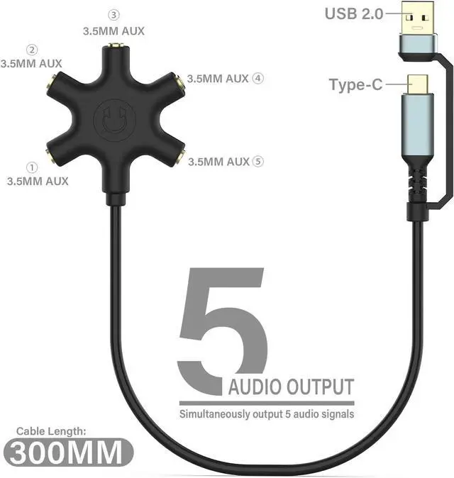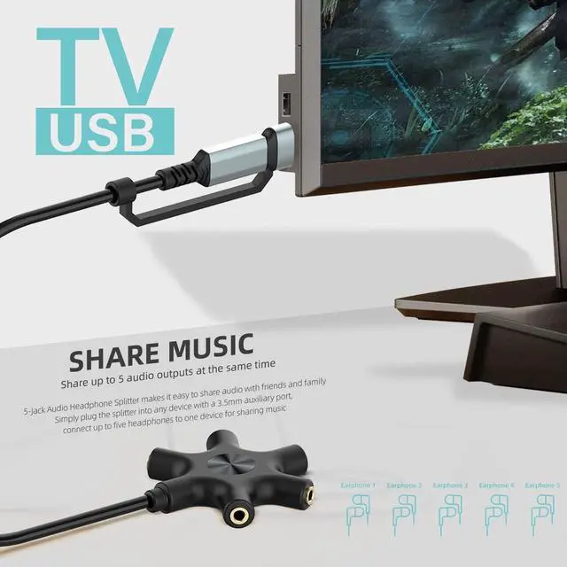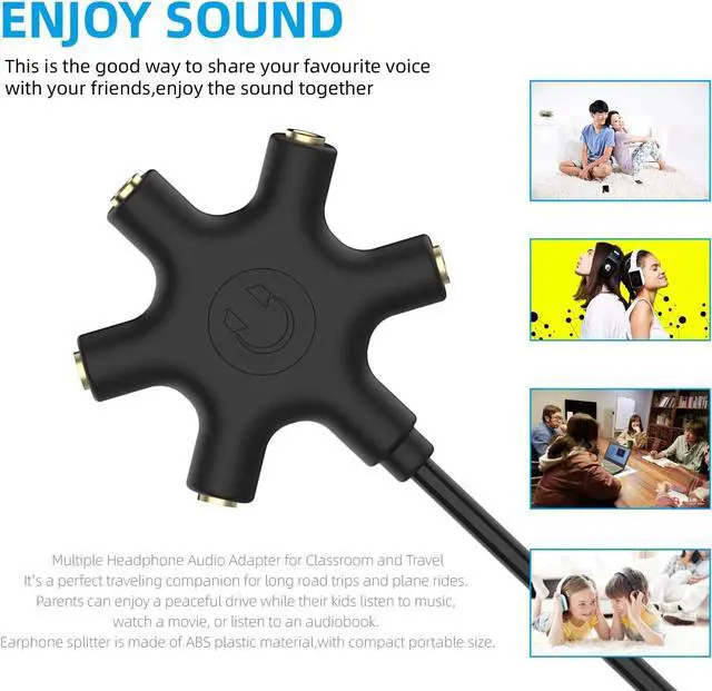 SPLITTER: Headphone adapter splits line into 5 auxiliary ( 3.5 mm) ports for easily sharing sound with up to 5 people5-Way Multi Headphone Audio Splitter Connector Headphone Splitter USB A C Audio Stereo Splitter Cable 1 Male to 5 Port Female Earphone Headset Splitter