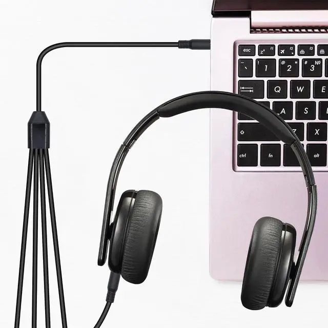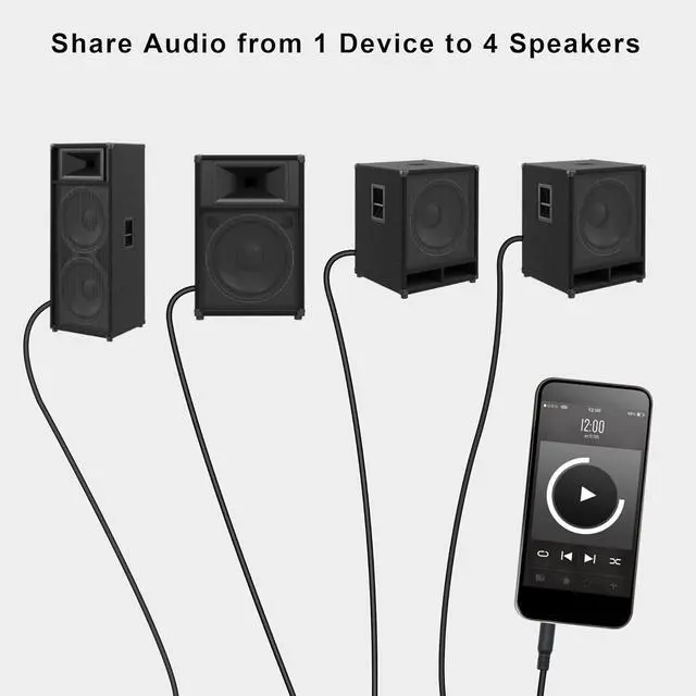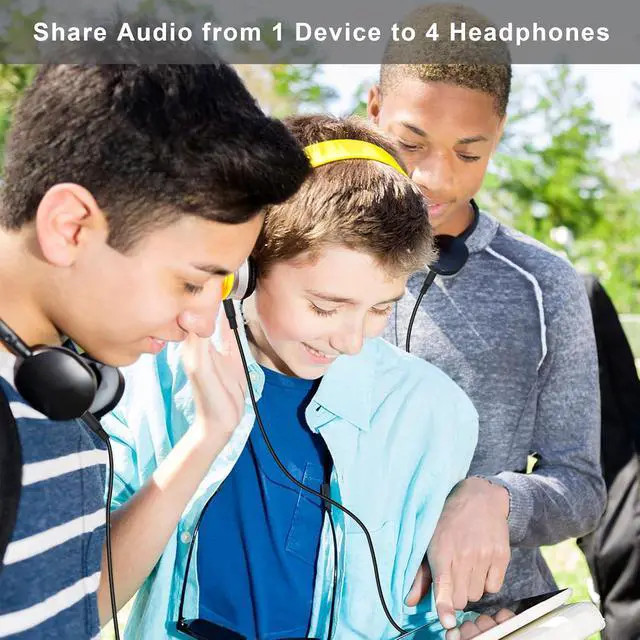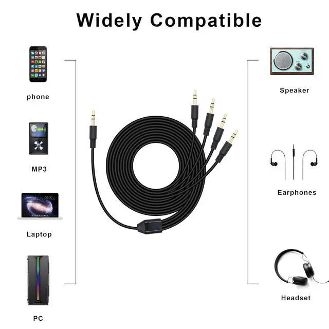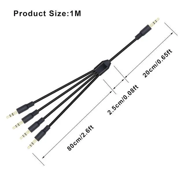 Headphone Splitter: 3.5 mm trs male to 4 3.5 mm 3-pole trs male splitter audio cable distributes audio from one device to 4 headphones/speakers. Share audio from the same source with family and friends.