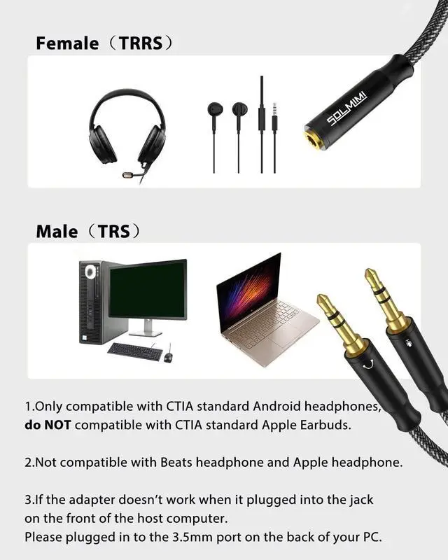 Warm Tips: If the mic doesn't work please plugged the splitter in to the 3.5 mm port on the back of your PC. 3.5 mm splitter works with CTIA standard Android headphones incompatible with CTIA standard Earbuds and Beats headphones.