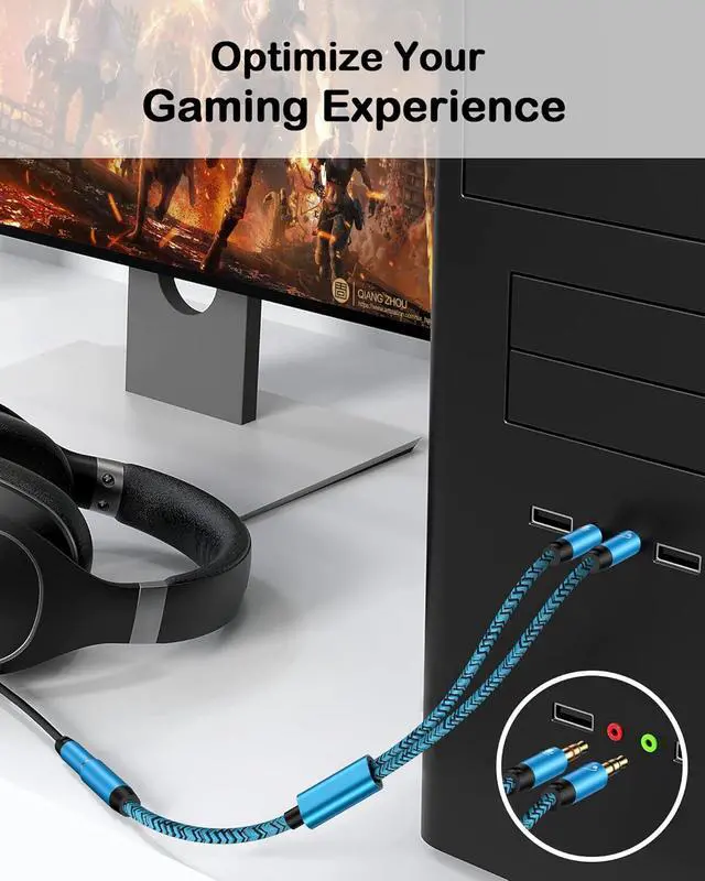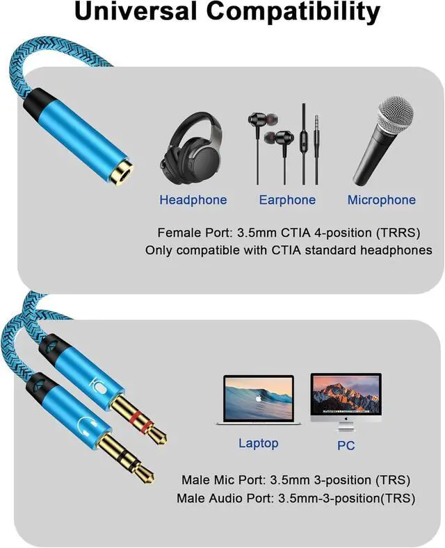 We Offer: 1Pack headphone splitter for pc in Blue. This 3.5 mm audio aux splitter 2-in-1 split mic and audio port - 1 x 4-Pole TRRS Female socket to 2 x 3-Pole TRS 3.5 mm Male (Black for TRS headphones port and the red for TRS microphone port on your PC)
