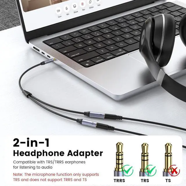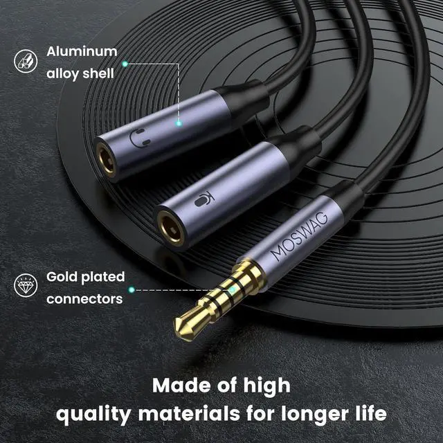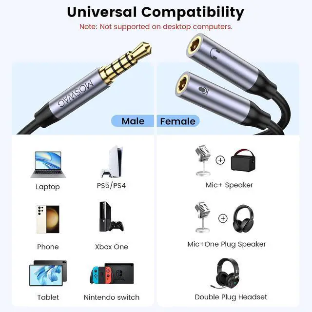 3.5 mm Audio Headphone Mic SplitterMOSWAG microphone and headphone splitter is designed to connect dual plug gaming headphones or the headsets which have a separate headphones (CTIA) and microphones (TRS) jack to a PC laptop or tablet solving the problem that the headphone can not be connected to a computer that only has a single 3.5 mm earphone jack. Before inserting the adapter into the computer please ensure that the headphones and microphone are correctly plugged into the adapterVersatile CompatibilityMOSWAG headphone splitter adapter is used for dual plug headphones one TRS microphone and one TRS speaker. One TRS microphone and one TRS headphone.