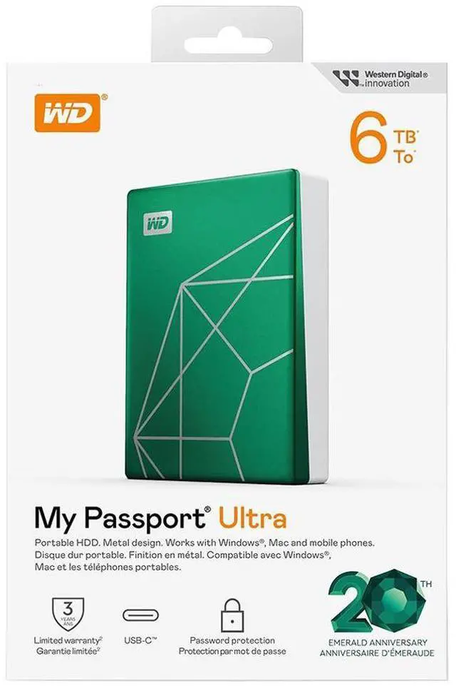 Back up your life with the My Passport Ultra portable hard drive. With its metal design for durability and 6TB of capacity, this compact drive helps keep your precious memories are safe. Enjoy seamless compatibility across your Windows PC, Mac, mobile phones, and tablets, with a USB-C connection. Help securely back up your data with the included Acronis True Image for Western Digital software, fortified with robust protection against ransomware threats. Add an extra level of security with password protection for peace of mind. With 20 years of storage and innovation, you can trust this reliable and convenient drive to back up what matters most in your life.