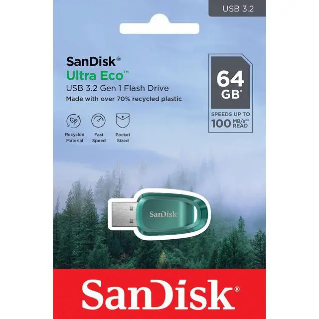 Choose the SanDisk Ultra Eco 64GB USB 3.2 Gen 1 Type-A Flash Drive for a high-capacity, high-speed, and environmentally conscious solution to your data storage needs.