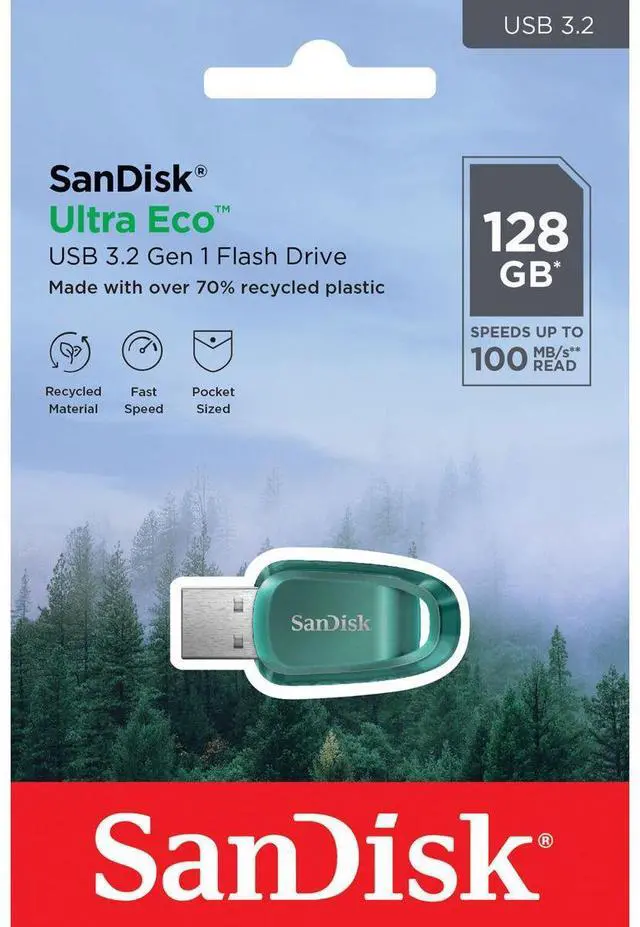 Designed with our planet in mind, the SanDisk Ultra Eco flash drive is made with over 70% recycled plastic, such as disposable water bottles. This saves over 50% CO2 emissions, fresh water, and energy during the manufacturing process. And, with capacities 128GB and time-saving transfer speeds up to 100MB/s, you can quickly store more of what matters most.
