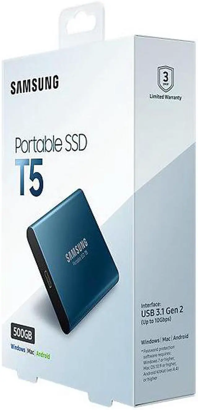 Samsung MU-PA500B. SSD capacity: 500 GB. USB connector: USB Type-A, USB version: 3.1 (3.1 Gen 2). Read speed: 540 MB/s. Data transfer rate: 10 Gbit/s. Product colour: Blue