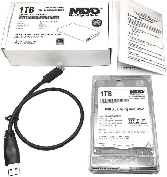 Features: Transparent Case (Clear) Stylish Design Build-in 1TB Capacity XBOX USB 3.0 External Gaming Hard Drive Easy Installation without open XBOX One Game Console USB Bus Powered (No additional AC Power adapter required) Plug and Play, Pre-Formatted in XBOX One Game Console Blue LED for Data access activities