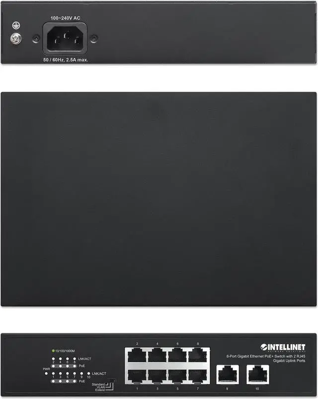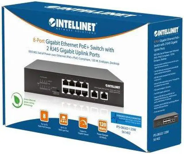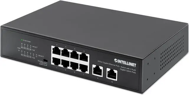 The Intellinet Network Solutions 8-Port Gigabit Ethernet PoE+ Switch with 2 RJ45 Gigabit Uplink Ports passes both data and electrical power to a number of PoE-compatible devices via standard network cables. Equipped with eight Gigabit Ethernet ports, theKEY_TAB switch can power wireless LAN access points and bridges, VoIP phones, IP video cameras and more while delivering network speeds of up to 1,000 Mbps. Equipped with eight auto-sensing 10/100/1000 Mbps RJ45 Gigabit Ethernet ports and two RJ45 uplink ports, Intellinet Network Solutions 8-Port Gigabit Ethernet PoE+ Switch with 2 RJ45 Gigabit Uplink Ports offers plenty of performance for your computers, servers and other networking devices.