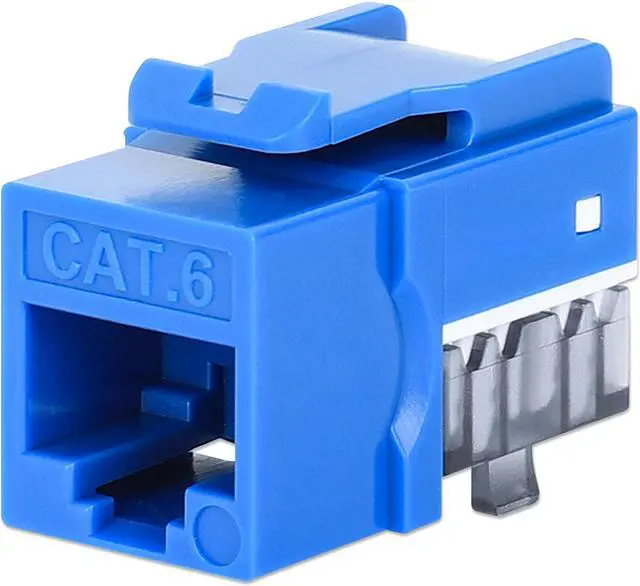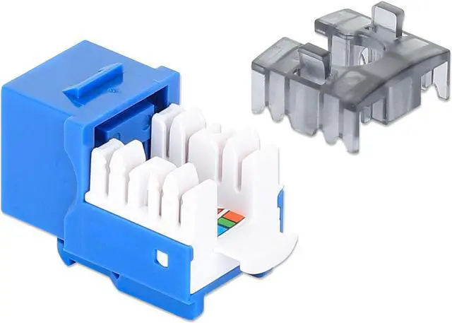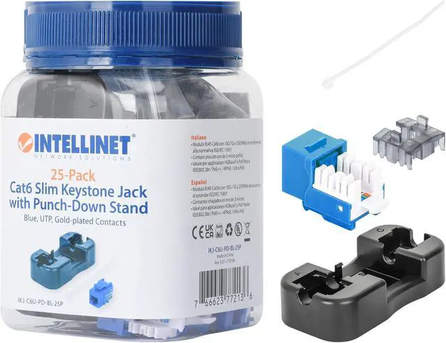 The Slim Cat6 Punch-Down Keystone Jack from Intellinet Network Solutions is designed for easy side-by-side deployment in blank patch panels, wall plates or surface connection boxes. This keystone jack is suitable for solid conductor cables for high-performance network applicationsKEY_TAB up to 10GBASE-T over 55 m (180 ft.) or 1000BASE-T over 100 m (328 ft.) with PoE applications up to IEEE802.3bt / PoE++ / 4PPoE / Ultra PoE. For high signal integrity, it is equipped with gold-plated contacts.