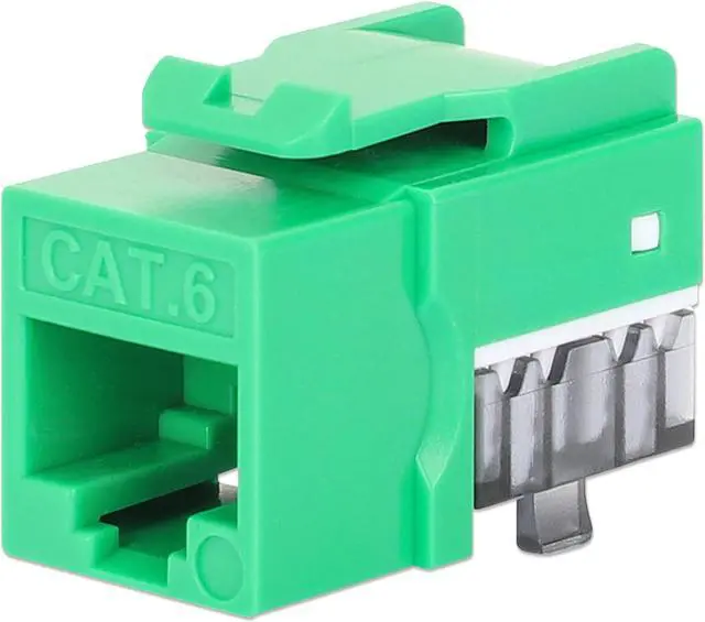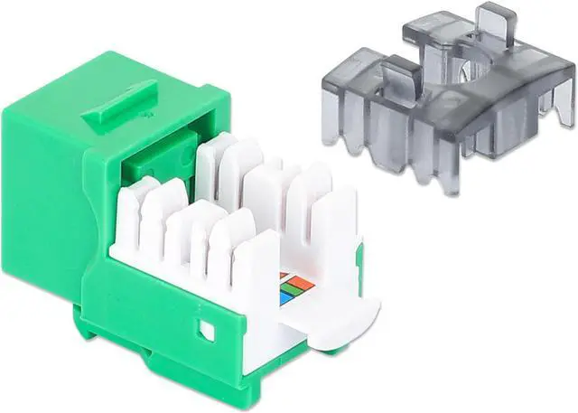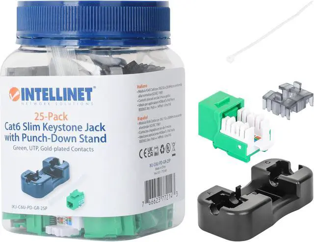 The Slim Cat6 Punch-Down Keystone Jack from Intellinet Network Solutions is designed for easy side-by-side deployment in blank patch panels, wall plates or surface connection boxes. This keystone jack is suitable for solid conductor cables for high-performance network applicationsKEY_TAB up to 10GBASE-T over 55 m (180 ft.) or 1000BASE-T over 100 m (328 ft.) with PoE applications up to IEEE802.3bt / PoE++ / 4PPoE / Ultra PoE. For high signal integrity, it is equipped with gold-plated contacts.