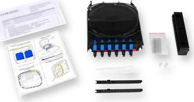 Each cassette is shipped with the pigtailed CCH adapter panel of choice, one rail for use with CCH-01U/2U/3U housings, and two rails used with CCH-04U housings. Grommets and cable ties for additional strain relief and protective braided tubing for incoming cable are also included. Splicing cassettes ship with the appropriate quantity and type of heat-shrink splice protectors.