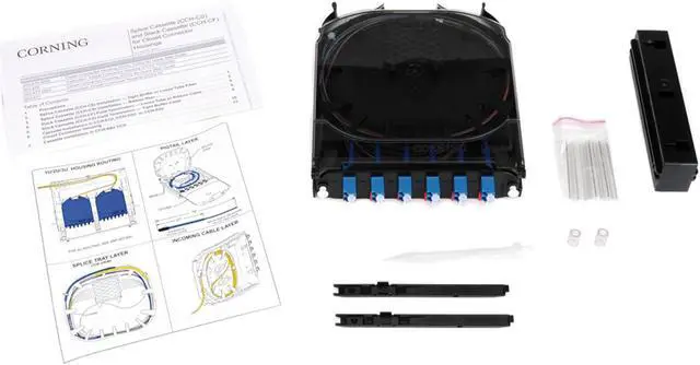 Each cassette is shipped with the pigtailed CCH adapter panel of choice, one rail for use with CCH-01U/2U/3U housings, and two rails used with CCH-04U housings. Grommets and cable ties for additional strain relief and protective braided tubing for incoming cable are also included. Splicing cassettes ship with the appropriate quantity and type of heat-shrink splice protectors.