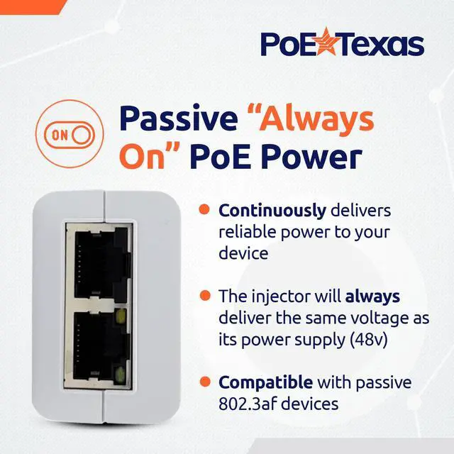 This injector uses passive "Always On" power for continuous delivery without negotiation delays. The 48V output delivers consistent voltage to 802.3af equipment.