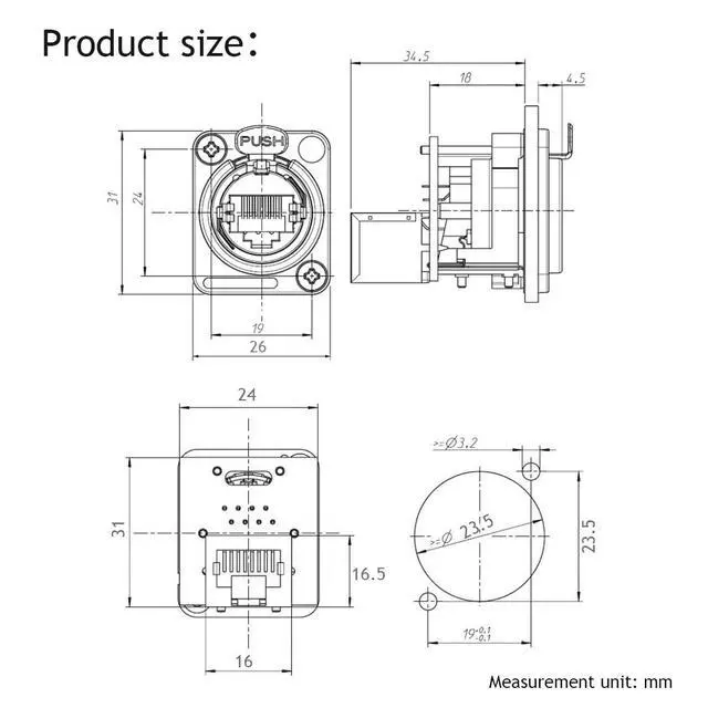 RJ45 connection system, optimized design, widely used in audio, video, and optoelectronic networks. Its base design is based on industrial standards Panel aperture construction.