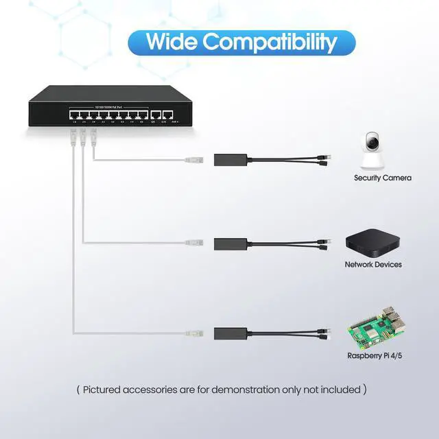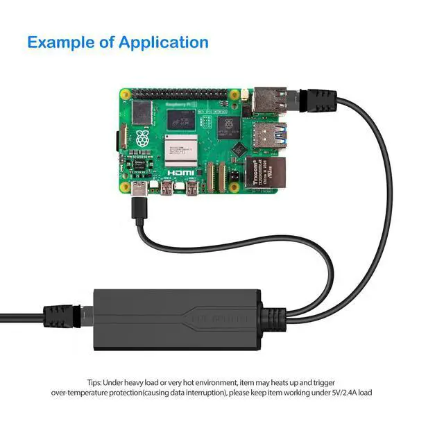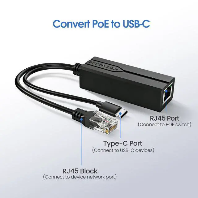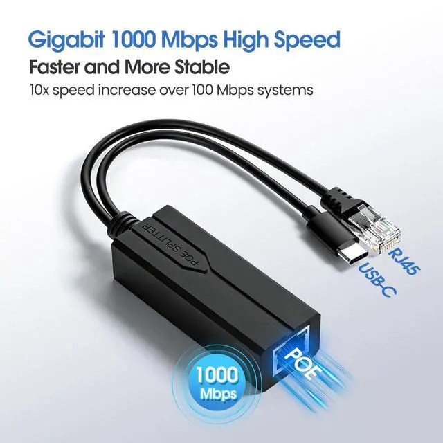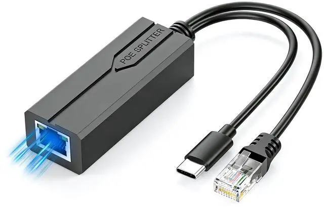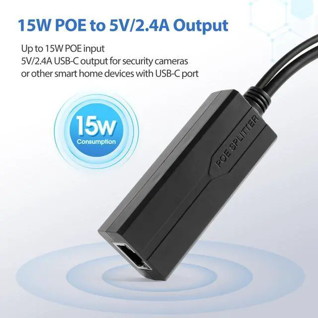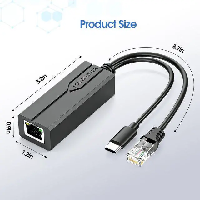 PoE Splitter USB C, POE to USB-C Adapter, 10/100/1000Mbps Gigabit Speed, 5V 2.4A Type-C port, IEEE 802.3af/at Compliant, Power Over Ethernet Splitter for Raspberry Pi 4/HomeLab/Security Cameras or other devices with USB-C port Product Name: 48V to 5V Type-C POE Splitter POE Voltage: 44V~57V Output Voltage: DC5V Rated Current: 2.4A Power Pin: 1/2(+), 3/6(-) or 4/5(+), 7/8(-) Compatible Protocol: IEEE802.3AF/AT MAX Power: 15W Data Speed: 10/100/1000Mbps Working Environment: -30~60 Size: 0.83*1.14*11.81inch(wire length 8.66 inches) Please note: If the POE splitter heats up and trigger over-temperature protection(causing data interruption), it may be 1) Hot environment; 2) Work under heavy load, please keep item working under 5V/2.4A load