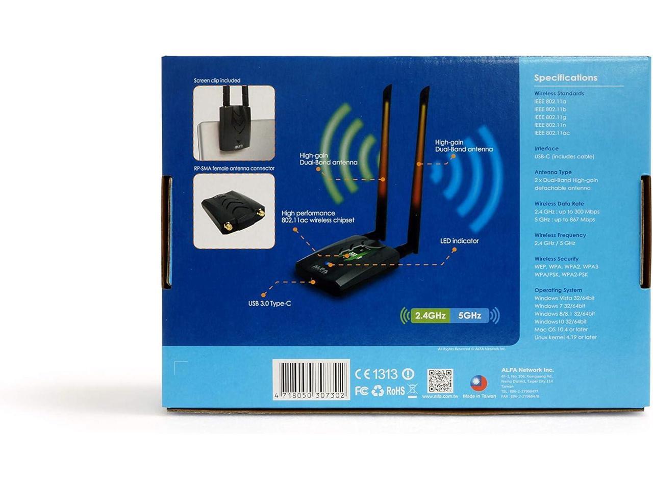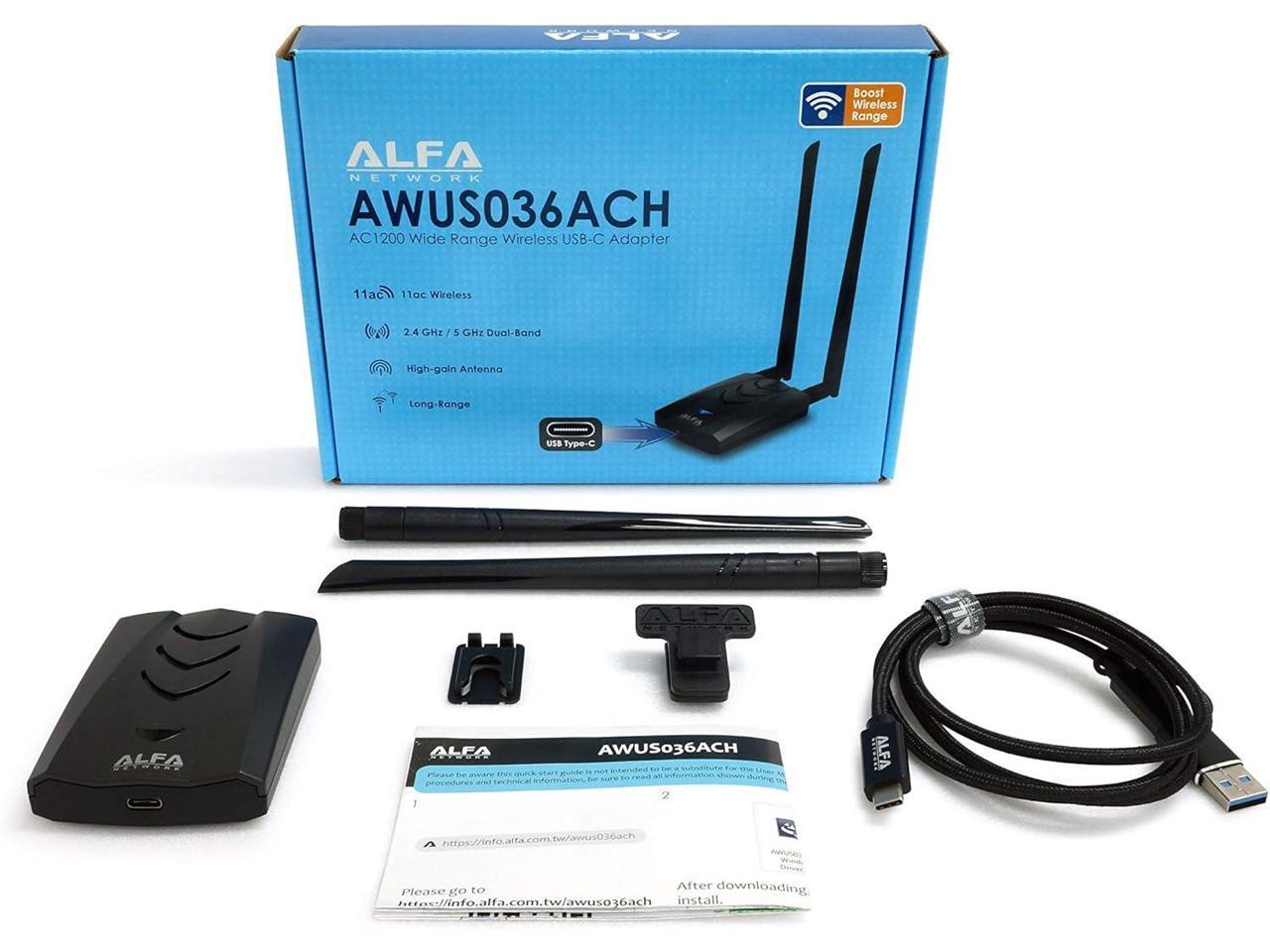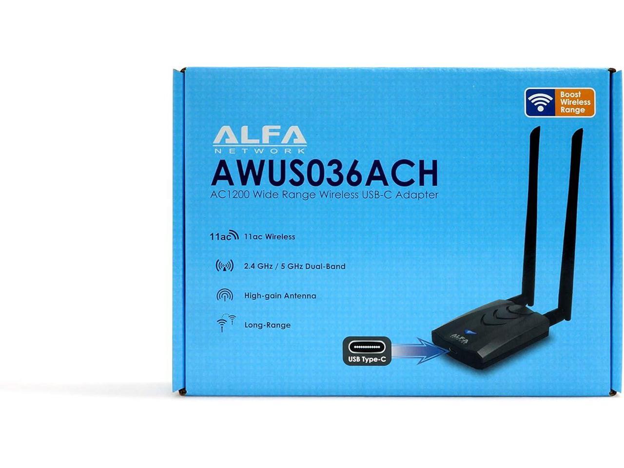 ?New Version Type-C WiFi USB? ALFA AWUS036ACH ?Type-C? Long-Range Dual-Band AC1200 Wireless USB Wi-Fi Adapter w/2x 5dBi External Antennas – 2.4GHz 300Mbps/5GHz 867Mbps – 802.11ac & A, B, G, N