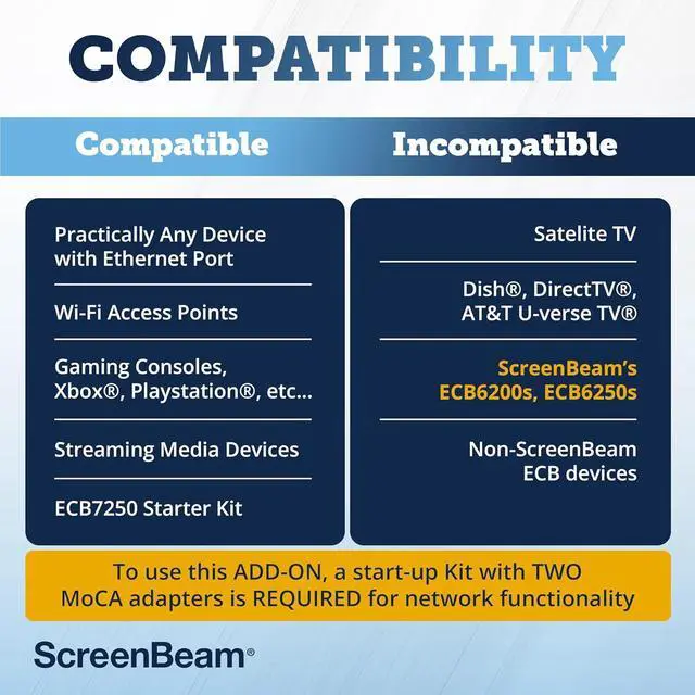 Non-Compatibility: This MoCA ethernet to coax adapter kit is not compatible with Direct TV, Dish or other satellite TV, AT&T internet, or AT&T U-verse coax networks. Comcast only supports MoCA 2.0 with Xfinity XB8. Turn off MoCA in your Comcast gateway to take full advantage of MoCA 2.5 in ECB6250 and ECB7250 Adapters