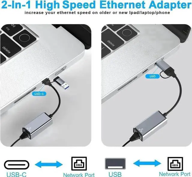 2-in-1 ethernet adapter designed for USB 3.0 and USB type-c devices to connect with your wired networks. This usb-c to ethernet adapter can be used for different devices and locations, providing speeds up to 1Gbps for multiple computers, laptops, work and games, and more.
