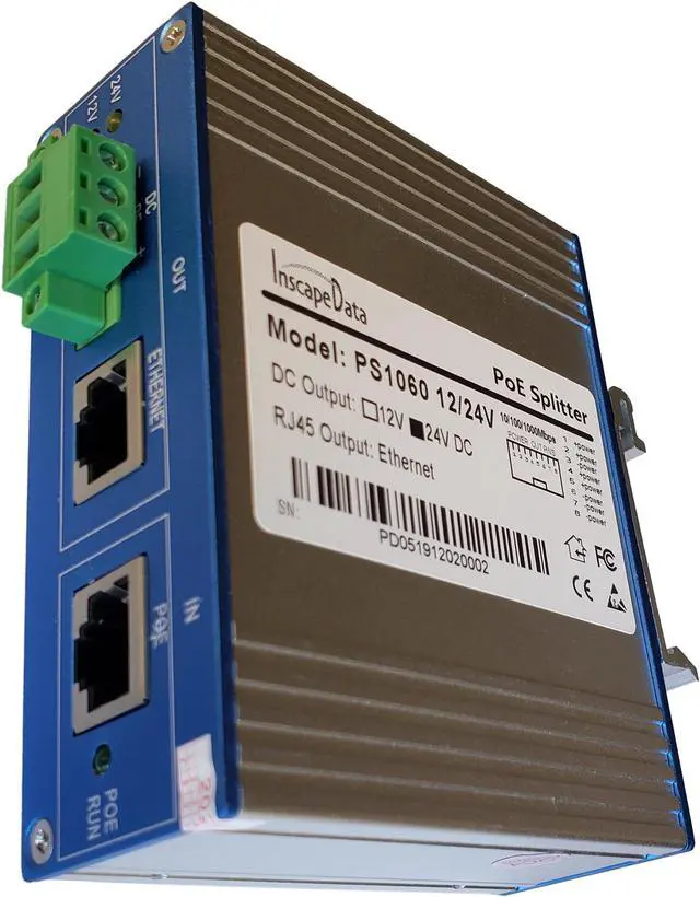 PS1060-24, Splits 802.3 bt high-power PoE power to 24V 60W DC power from a 56V power source delivered via an Ethernet cable with the other following key features: