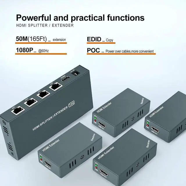(1) Transmits 1 HDMI video and audio signals up to 50M over a single CAT6 cable, (Cat5e---45m);