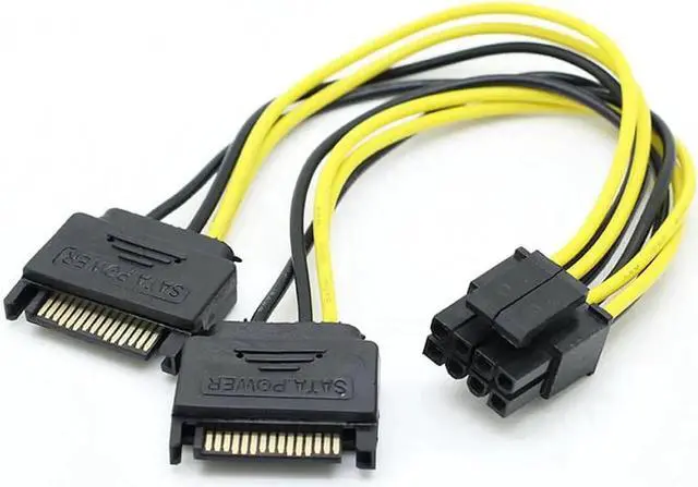 This is a 15Pin SATA Male To PCIe 8Pin Male Video Card Power Cable. * The current computer power supply in order to save costs, not for 8PIN graphics card power supply, or mining design or mining with a multi-graphics card when the power supply is not enough, with a single line of current is not enough.* Now with this conversion line can solve the problem, directly to double SATA 15PIN power to graphics card 8PIN power port, added graphics card current.* Because high-end graphics cards are used 8PIN power supply, the current is relatively large, with a single SATA port current is not enough, easy to burn line. So you must use two SATA port to provide 12V power supply to 8PIN graphics Card.