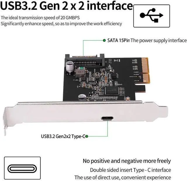This adapter card can convert the PCIe interface on the motherboard to a USB3.2 Type-C high-speed data transmission interface, and the theoretical transmission speed can reach 20Gbps. It is also backward compatible with USB3.2Gen2 devices. The speed of USB3.2Gen2x2 is twice that of USB3.2Gen1. It is specially manufactured to provide faster and higher data transfer rates for personal computers, consumer electronics and communication devices.