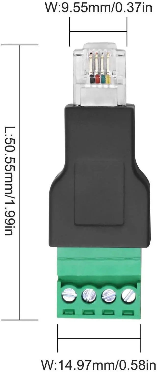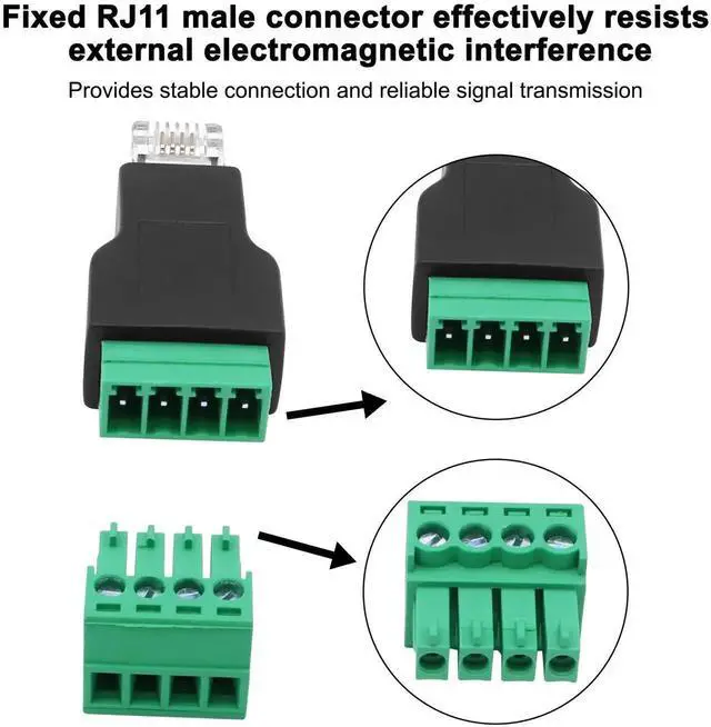 The fixed RJ11 male connector effectively resists external electromagnetic interference, ensuring stable connections and reliable signal transmission.The RJ11 to screw terminal adapter is wired according to the EIA/TIA 568B cabling standard and is suitable for structured cabling systems.