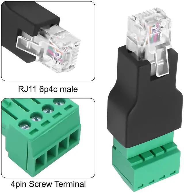 RJ11 to 4 Pin Screw Terminal AdapterThis RJ11 6P4C male to 4-pin screw terminal block conversion adapter is typically installed on telephones and their cables to establish a bridge connection between telephone lines and critical telephone system control lines.