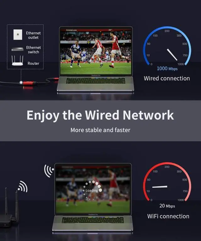 Higher Speed USB-C Network Adapter: Up to 1000Mbps data transmission speed, backward compatible with 100Mbps/10Mbps, which is 10x faster than WiFi connection. (To reach 1Gbps, make sure to use CAT6 & up Ethernet cables. )