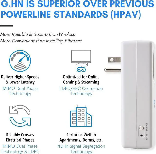 [THE NEWEST STANDARD IN POWERLINE] Delivers better real world performance with unique G. hn algorithms that improve upon older powerline standards. Technology like MIMO Dual Phase Technology delivers a faster and more reliable connection and LDPC to reliably cross phases