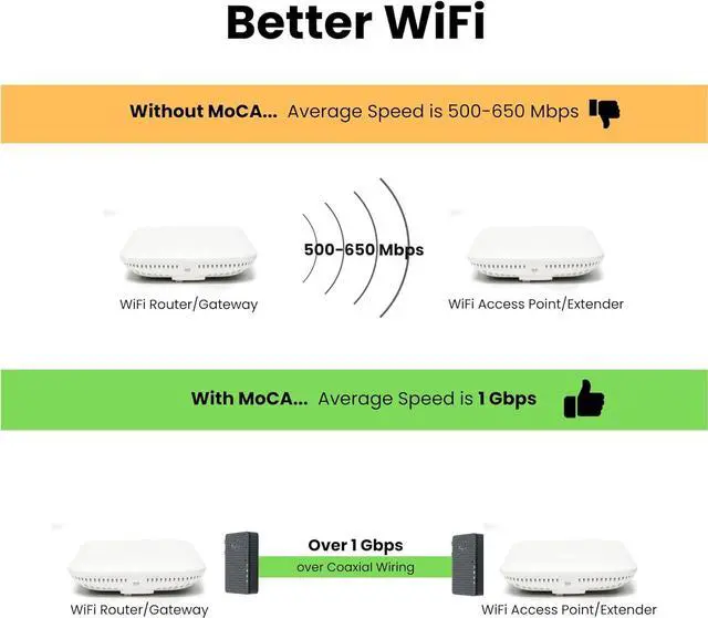 GET BETTER WIFI. Increase the speed (up to 1 Gbps) between your WiFi Router and Access Point by connecting one Coax to Ethernet Adapter to your Router and another to a WiFi Extender or Access Point.