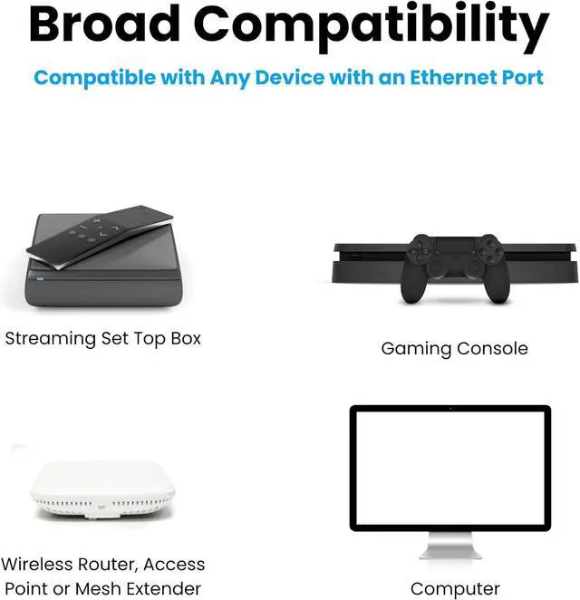 COMPATIBLE WITH ANY DEVICE WITH AN ETHERNET PORT. This includes HDTV, personal computers, Xbox, PlayStation, streaming HD audio and media, and more. Not compatible with satellite TV or AT&T U-verse Coax networks.