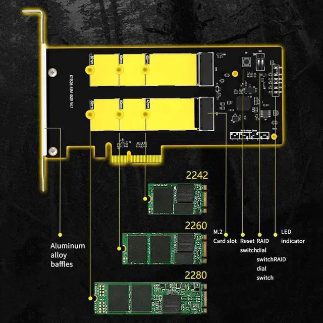 Support PCIe X4, compatible with X8/X16 motherboard card slot, support three sizes of PCIe interface. Supports three sizes 2240/2262/2280, SATA protocol M. 2 hard drive