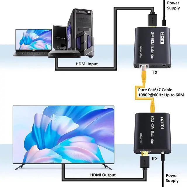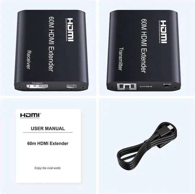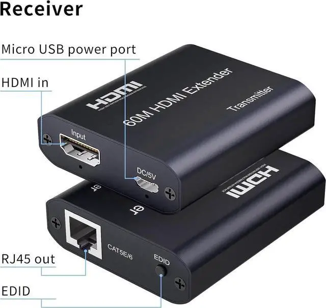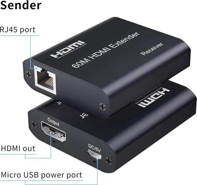 60M HDMI Extender: The RJ45 Ethernet extender can transmit HDMI 1080p signal to above 60 Meters/ 196ft by connecting Cat5e/ 6/ 7. Ideal for home, office, outdoor/ indoor scenes
