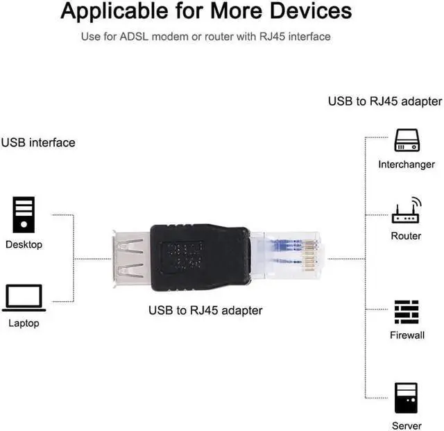 This USB 2.0 to RJ45 adapter connects standard USB ports to Ethernet network connections effortlessly. The integrated female USB and male RJ45 plug offers flexible wiring and convenient expansion. Made of durable premium material for long-lasting use and stable signal output. Mini portable size suits home, office and travel scenarios, an essential compact accessory for expanding wired network access.