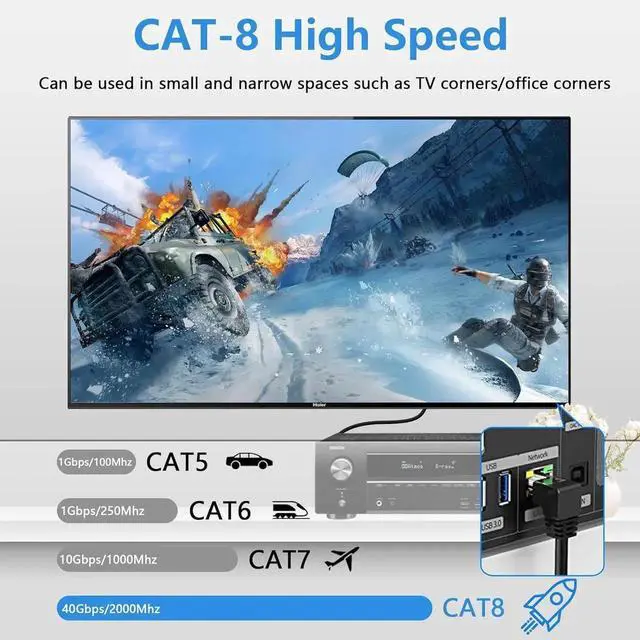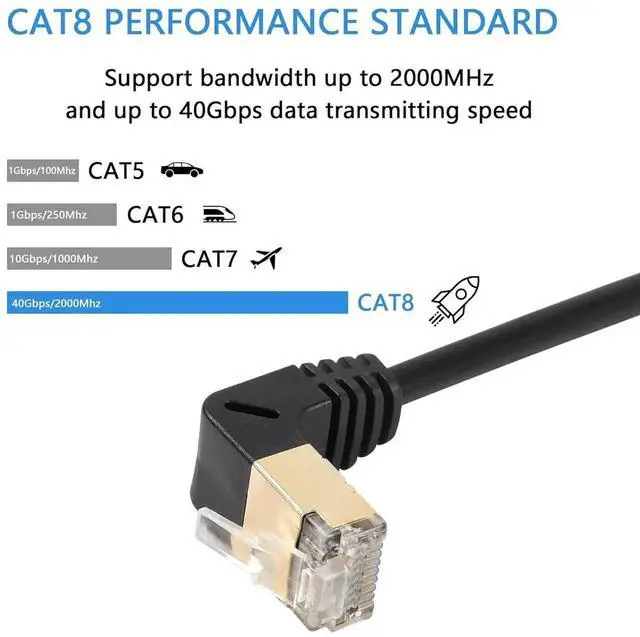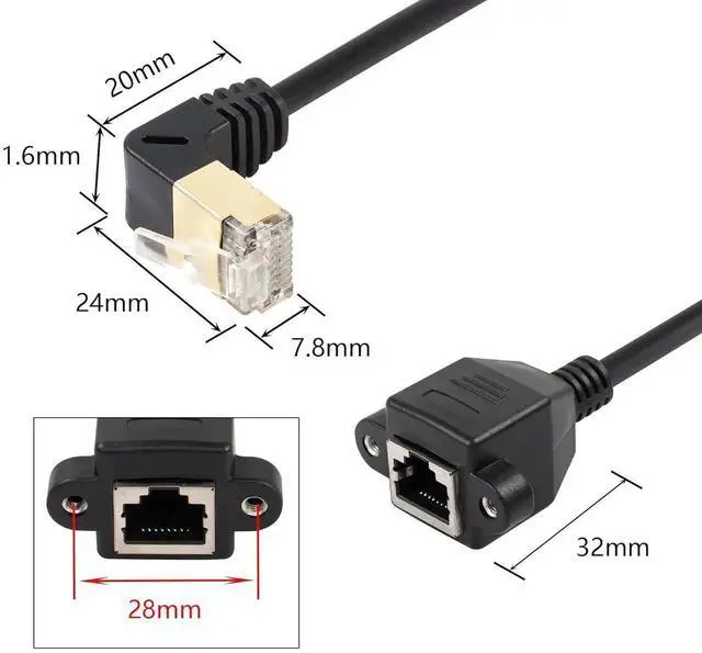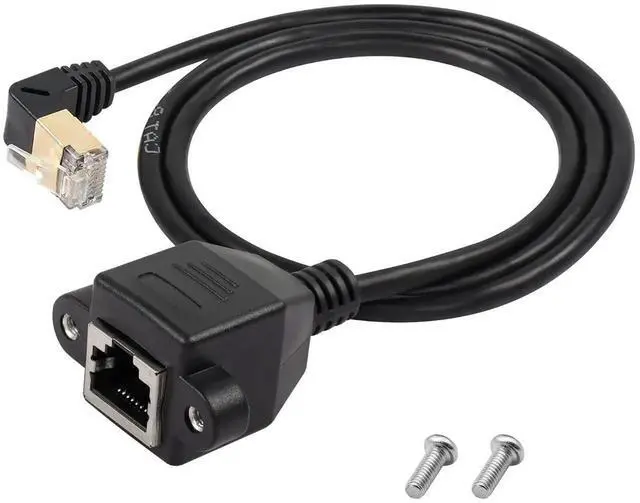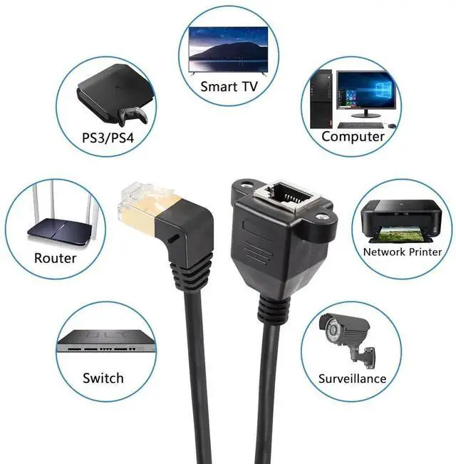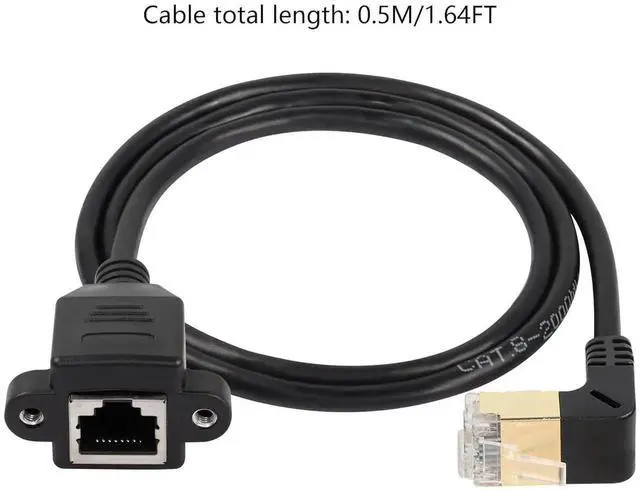 This upward 90-degree Cat8 shielded Ethernet extension cable comes with RJ45 male to female connector and reserved screw holes for firm panel mounting. The upward angle layout optimizes wiring in narrow gaps and protects interface from extrusion damage. Adopting full shielding technology, it greatly isolates electromagnetic interference and ensures continuous high-speed low-latency connection. Premium oxygen-free copper core and gold-plated contacts enhance durability and signal conductivity. Suitable for routers, computers, smart TVs, switches and industrial equipment wiring expansion.