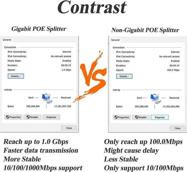 This high-performance gigabit active PoE splitter adheres to IEEE 802.3af/at standards, converting 48V PoE input into steady 12V 2A DC power. It maintains full gigabit network bandwidth to ensure lag-free video and data transmission. Designed with 5.5x2.5mm connector and compatible with 5.5x2.1mm interface devices. Simple plug-and-play operation without complex setup, widely suitable for IP cameras, CCTV surveillance equipment and other 12V non-PoE wired devices for reliable power and network separation.