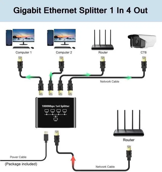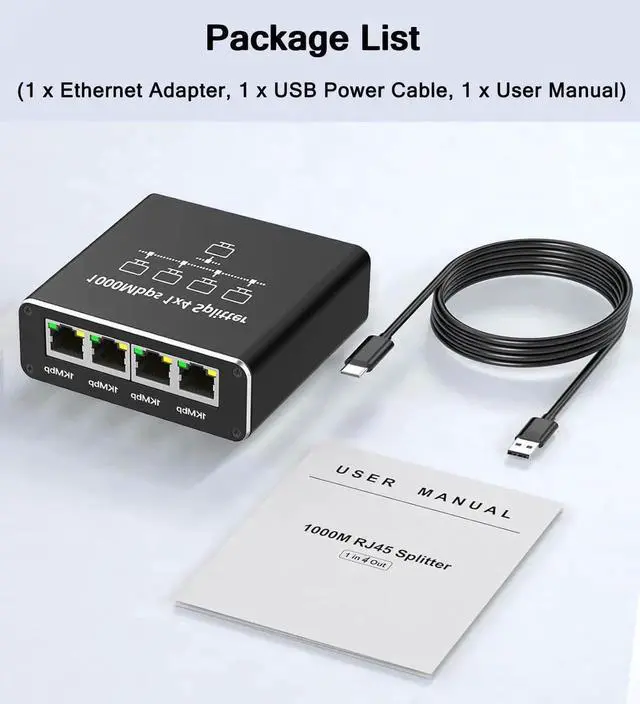 [Ethernet Splitter 1 to 4]This ethernet cable splitter splits a single cable into four outputs, allowing four computers to share a single Ethernet cable at the same time, solving the problem of frequently changing cables, and is designed to solve connectivity problems caused by insufficient cabling. It can help you expand your network ports. Note: power must be supplied during use. (package included USB cable)