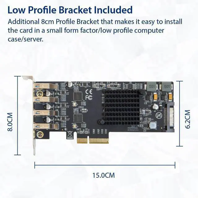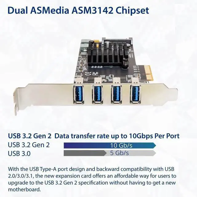 Add four USB 3.2 10Gbps ports to your system. Powered by dual ASMedia ASM3142 controllers to provide dedicated 10Gbps USB 3.2 transfer bandwidth for each port through PCIe 3.0 x4 host interface.