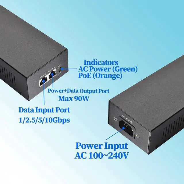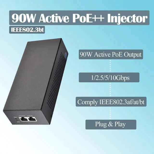 The PSE90BT-10G is a 1/ 2.5 /5/10Gbps Power over Ethernet Injector with one Ethernet Input (data only) port and one Output (data + power) port that is designed for small or medium network environments. The PSE90BT-10G supplies remote power for new applications such as wireless access points, pan-tilt-zoom (PTZ) IP cameras and videophones.