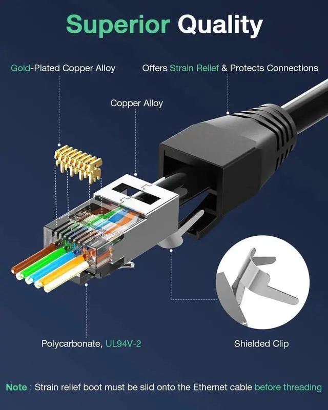 VCELINK CAT6A Connector, RJ45 Connectors Pass Through CAT6A CAT7 Shielded, UL-Listed 3-Prong Gold Plated, CAT7 Connector with Strain Relief Boots (RJ45 Connector-Black, Black, 30-Pack)