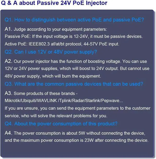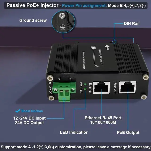 12~24V DC Input- The passive PoE injector supports 12~24V DC input and boost to 24V PoE output. It will solve the problem that you only have 12V centralized power supply.