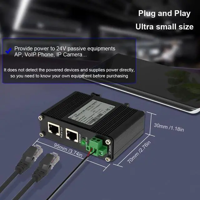 3.74 x 2.76 x 1.18 in Small Size- The 24V PoE injector has compact design and need small space to install. Plug and play, convenient to operate.
