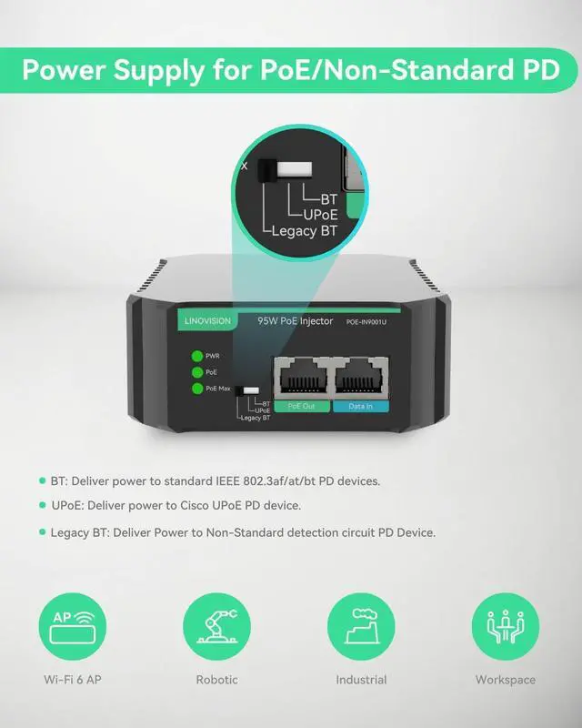 Excellent Compatibility with PoE and Legacy Non-Standard PoE Devices: Easily switch modes with a DIP switch to deliver reliable power to standard PoE, non-standard (Legacy), and Cisco devices (UPoE), ensuring compatibility for various power needs. It delivers standard IEEE 802.3 af/at/bt PoE output, ensuring safer and more efficient in energy use.