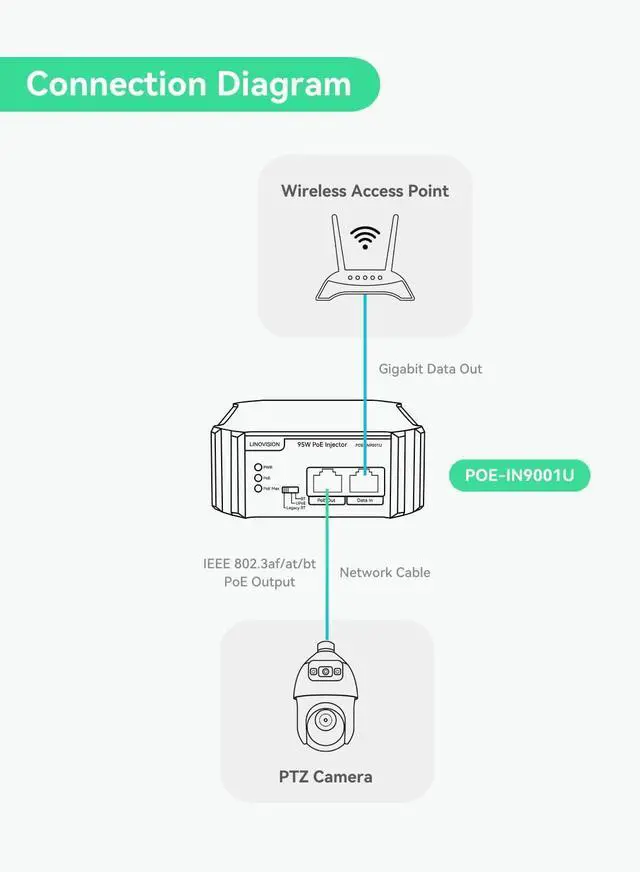 PoE Injector: Convert single ethernet port to IEEE 802.3 af/at/bt 90W PoE++ port, supply sufficient PoE power for IP camera, PTZ camera, PoE speaker, Wireless AP, etc.