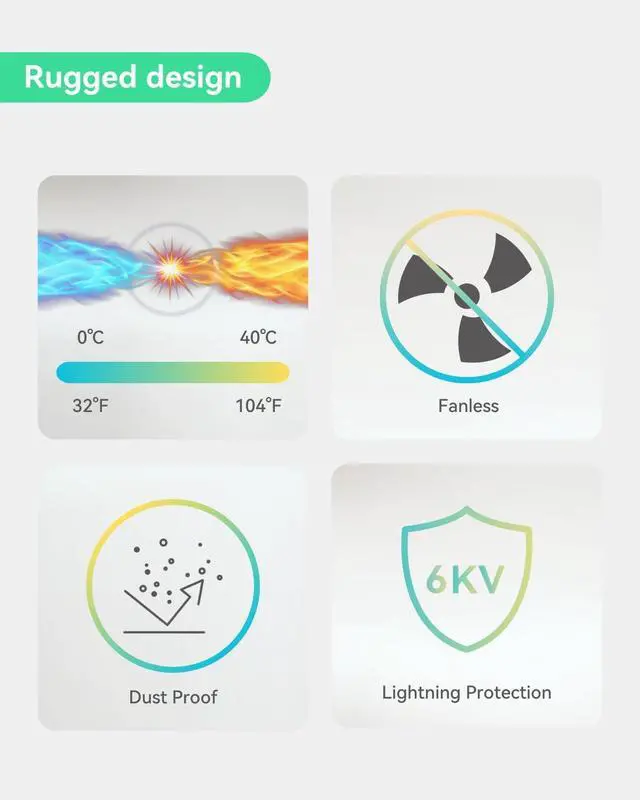 Industrial Design: Fanless design ideal for silent operation. Support wall mounted installation. Wide working temperature 32 to +1040 to 40), 6KV surge immunity, 8 kV ESD protection.