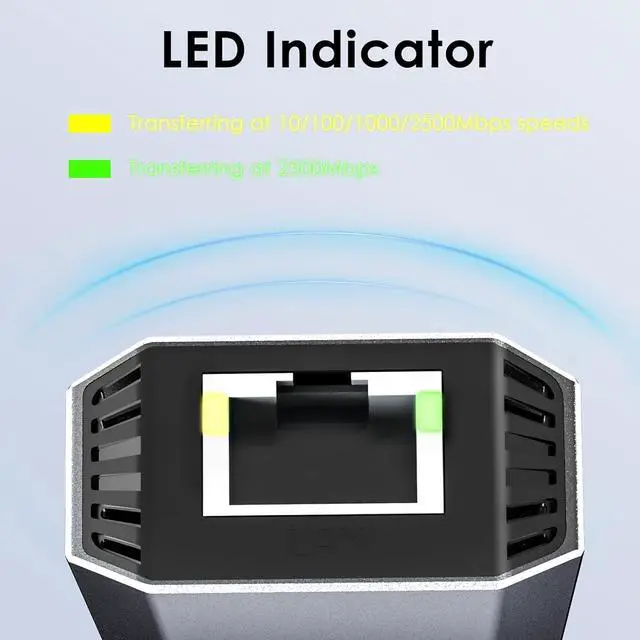 Instant Internet: Upgrade your network without updating your cables. With the 2 indicators, you can easily check the network speed. 2.5 Gigabit Ethernet signals are designed to work on Cat 5e or higher rated Ethernet cord, does not exceed 100m in length, just pair your USB Ethernet Adapter with 2.5G bps-capable switches/routers