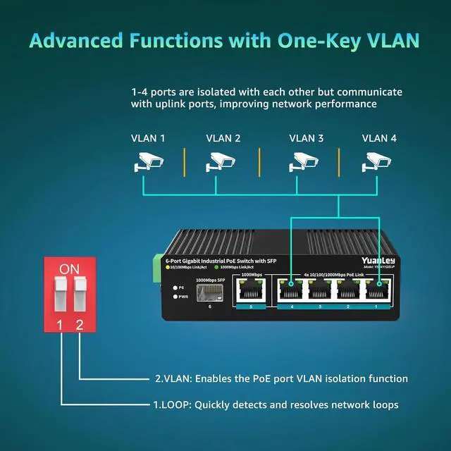 Full Gigabit PortsYuanLey 6 ports industrial poe switch includes 4 Gigabit PoE/PoE+ ports, 1 Gigabit Uplink and 1Gigabit SFP port; 1-4 ports support IEEE 802.3 af/at. Single port PoE power up to 30W, the maximum PoE output power is 120W, it can automatically detect and recognize the power receiving equipment that meets the standard and supply power through the network cable.